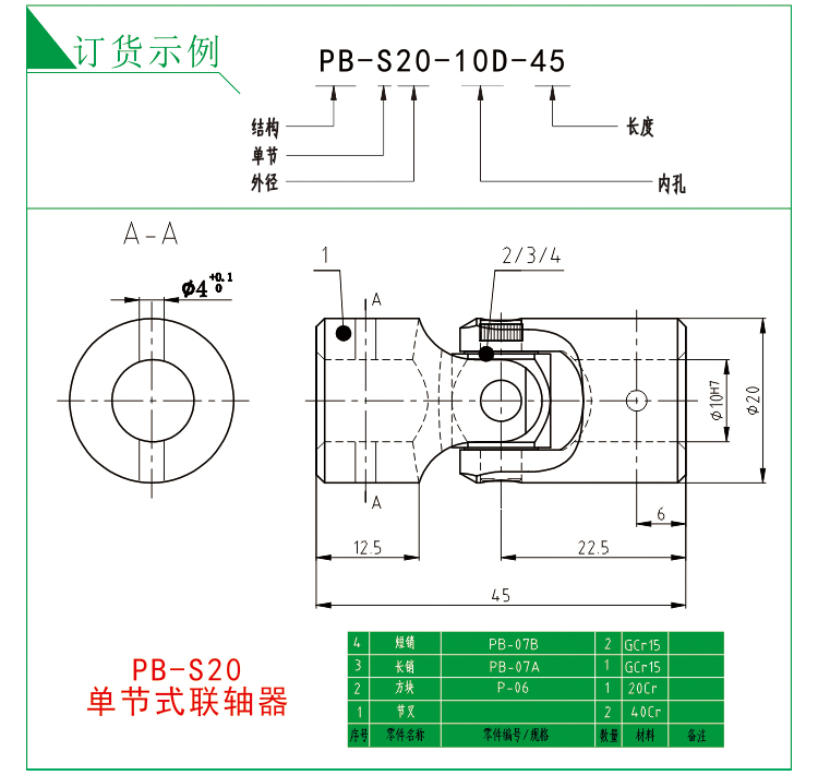 PB結構訂貨示例: PB-S20-10D-45